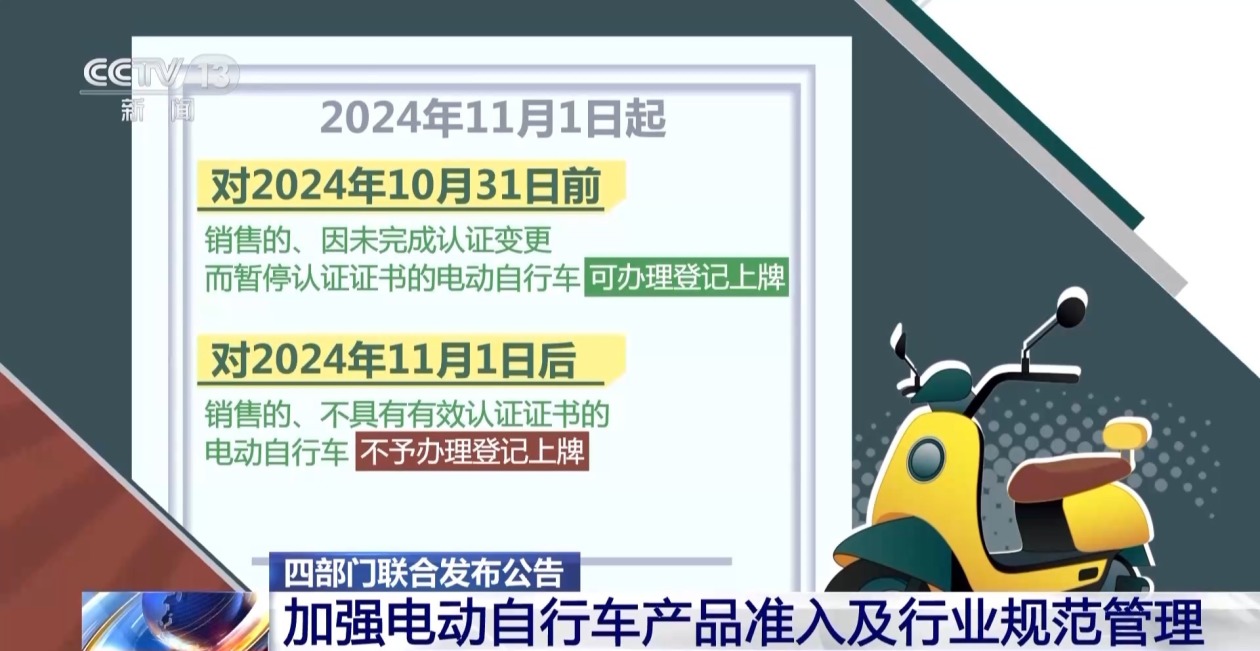 自2024年11月1日起,不符合《电动自行车电气安全要求》等相关强制性国家标准的电动自行车不得生产、销售、进口。对新提出认证委托的电动自行车,应符合相关强制性国家标准及修改单要求,经过认证并标注认证标志后,方可出厂、销售、进口或者在其他经营活动中使用。