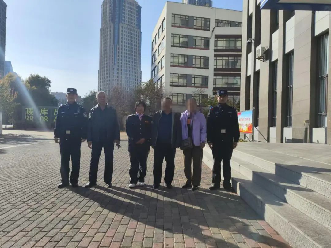 在派出所门前,纪春燕(左三)和男子(右三)合影