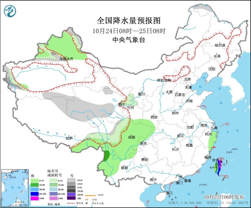 10月24日08时至25日08时,新疆沿天山地区和南疆西部山区、西藏北部、青海中南部、川西高原北部等地部分地区有小到中雪或雨夹雪。云南西北部、台湾岛大部等地部分地区有中到大雨,其中,台湾岛中东部等地部分地区有暴雨或大暴雨(100~200毫米)(见图3)。
