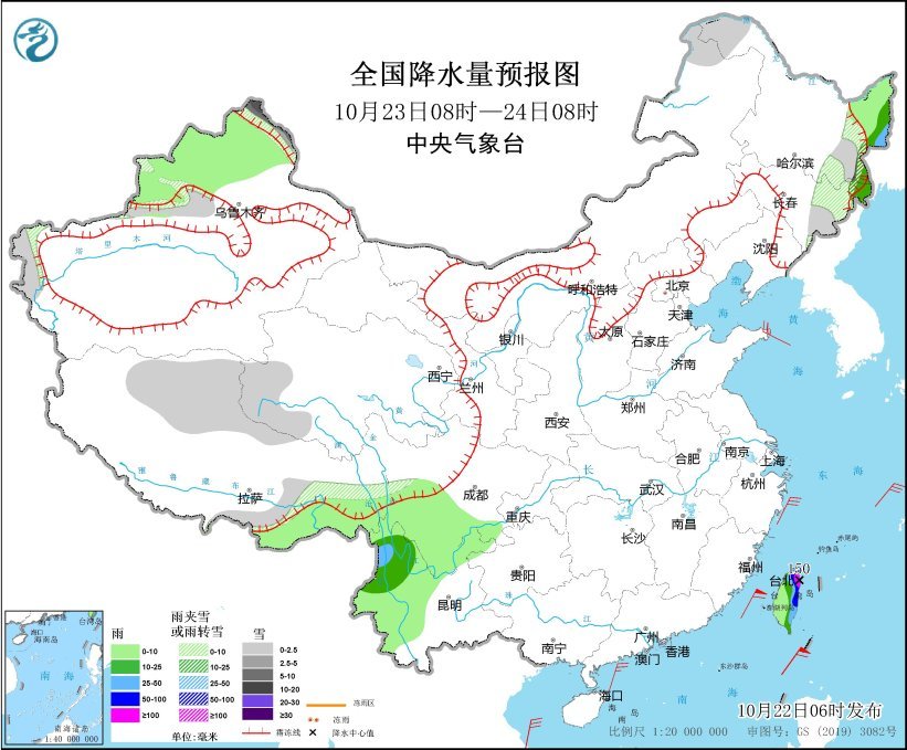 10月23日08时至24日08时,新疆北部阿勒泰山区和天山山区、内蒙古东北部、黑龙江西北部和东南部、吉林东部、西藏东部和北部、青海南部等地部分地区有小到中雪或雨夹雪,其中,新疆北部阿勒泰山区等地部分地区有大到暴雪。黑龙江东部、吉林东北部、云南西北部、台湾岛大部等地部分地区有中到大雨,其中,台湾岛北部和东部等地部分地区有暴雨或大暴雨(100~150毫米)(见图2)。