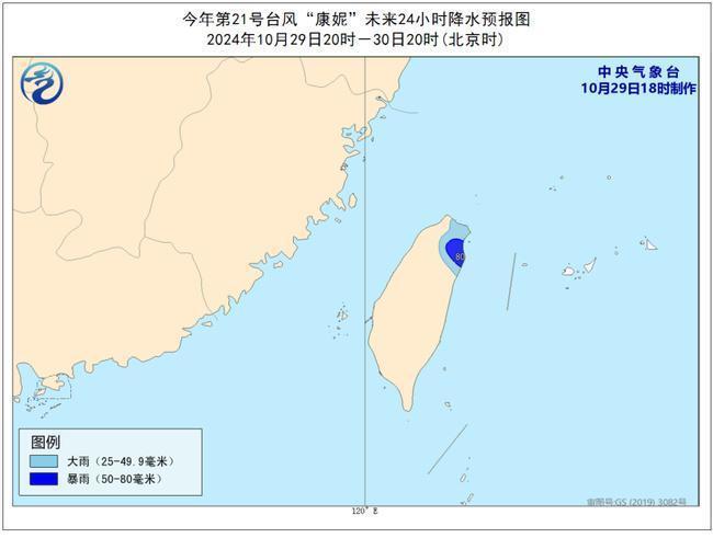 降水预报:29日20时至30日20时,我国台湾岛东北部部分地区有大雨或暴雨(50—80毫米)。