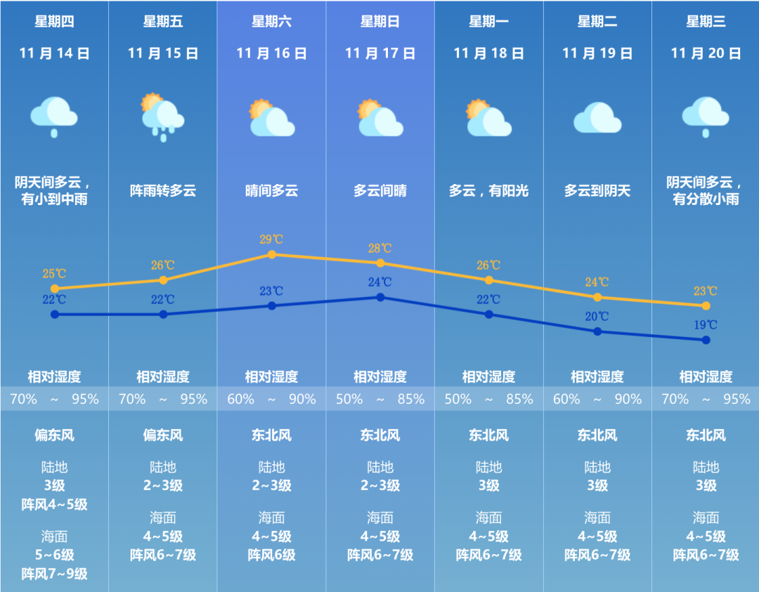 受“桃芝”外围环流影响,预计今晚到明天我市有小到中雨,沿岸和海面风力较大;15日阵雨转多云,风力明显减弱;展望16-17日天气转好。