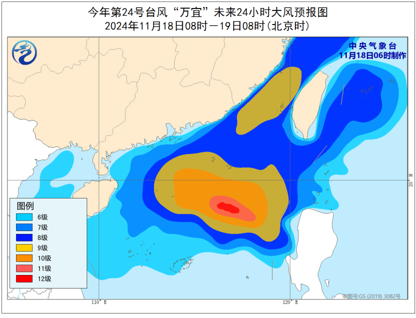 大风预报:18日08时至19日08时,受冷空气和“万宜”的共同影响,南海北部和中部、巴士海峡、台湾海峡、台湾以东洋面、东沙群岛、中沙群岛、西沙群岛、福建沿海、台湾岛沿海、广东沿海、海南岛东部和南部沿海将有6-8级,阵风9-10级的大风,其中台湾海峡、南海北部风力有9-10级,阵风11-12级,台风中心经过的海域或地区风力有11-12级,阵风13-14级。