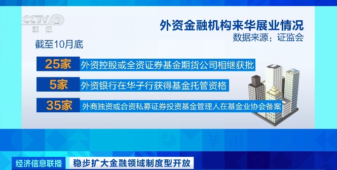 在机构开放方面,外资机构来华展业便利度也不断提升。截至10月底,已有25家外资控股或全资证券基金期货公司相继获批,5家外资银行在华子行获得基金托管资格,35家外商独资或合资私募证券投资基金管理人在基金业协会备案。