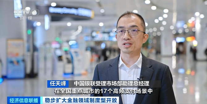 中国银联受理市场部助理总经理 任天峰:我们与36个国家和地区的超过200个境外钱包开展合作,在全国重点城市的17个高频支付场景中,银联卡整体的受理覆盖率达到93.4%。