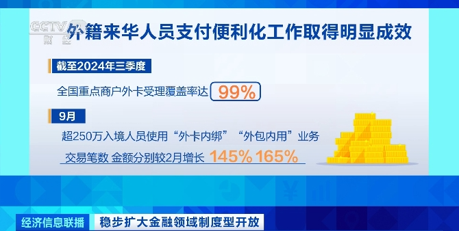外籍来华人员支付便利化工作取得明显成效,截至2024年三季度,全国重点商户外卡受理覆盖率达99%;9月,超250万入境人员使用“外卡内绑”“外包内用”业务,交易笔数、金额分别较2月增长145%、165% 。