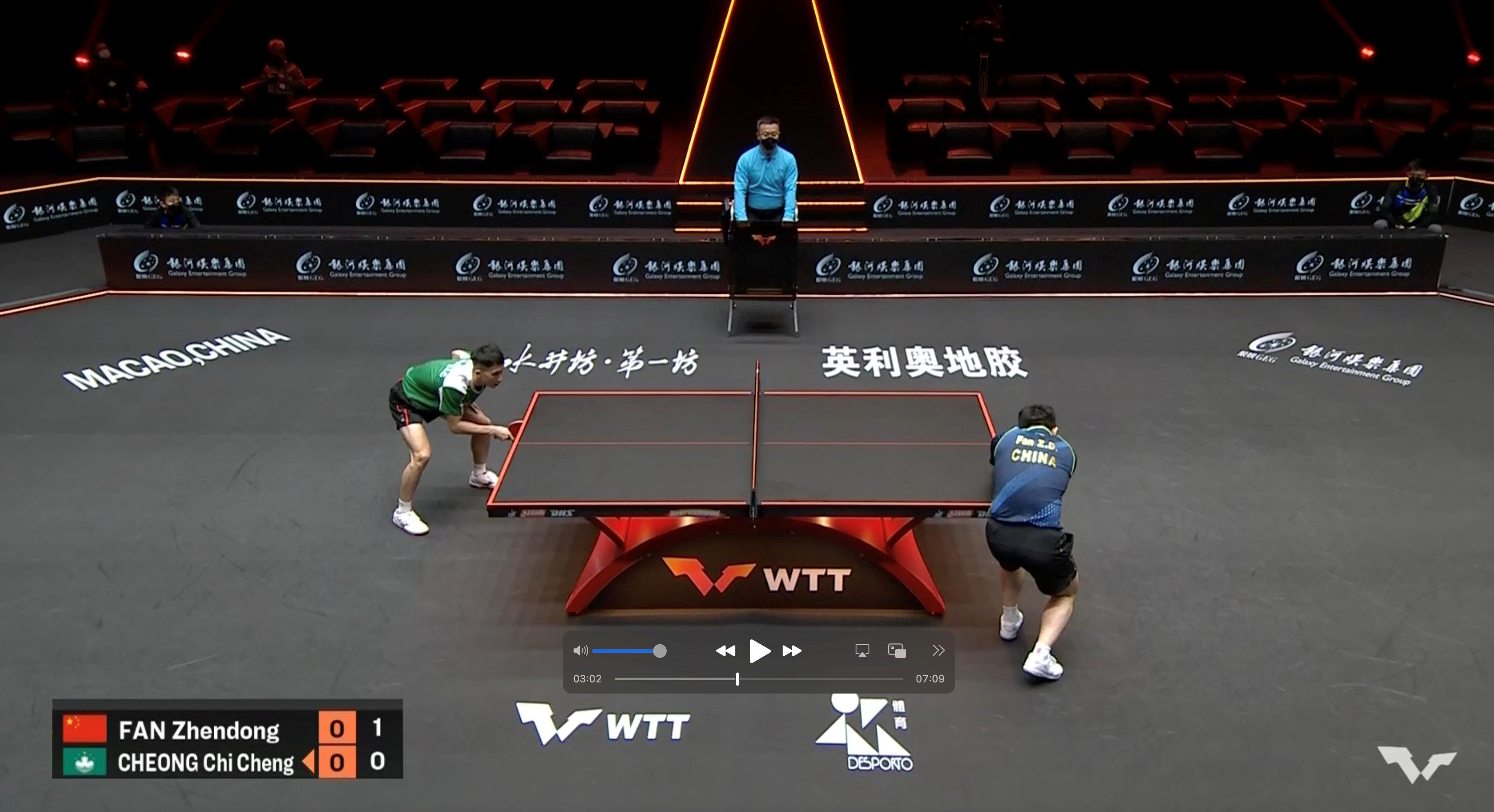 2022年WTT澳门冠军赛男单八分之一决赛张子澄与樊振东“交手”